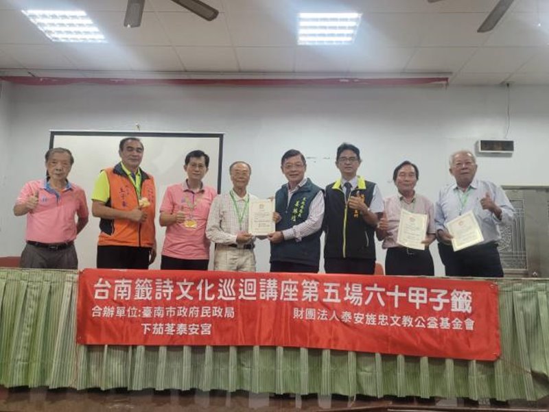 【記者黃石泉/台南報導】台南市政府民政局與財團法人泰安旌忠文教公益基金會於10月12日至13日在後壁泰安宮舉辦「台南籤詩文化巡迴講座(第五場)」圓滿完美落幕,本次活動吸引了各宮廟執事幹部、解籤員及文史工作者熱烈參與,並由多位籤詩專家與學者親臨指導,深入淺出地解析籤詩文化的歷史淵源與其在現代社會的意義。透過講座,與會者對於如何正確解讀籤詩以及籤詩文化的實踐,均有更深入的了解。