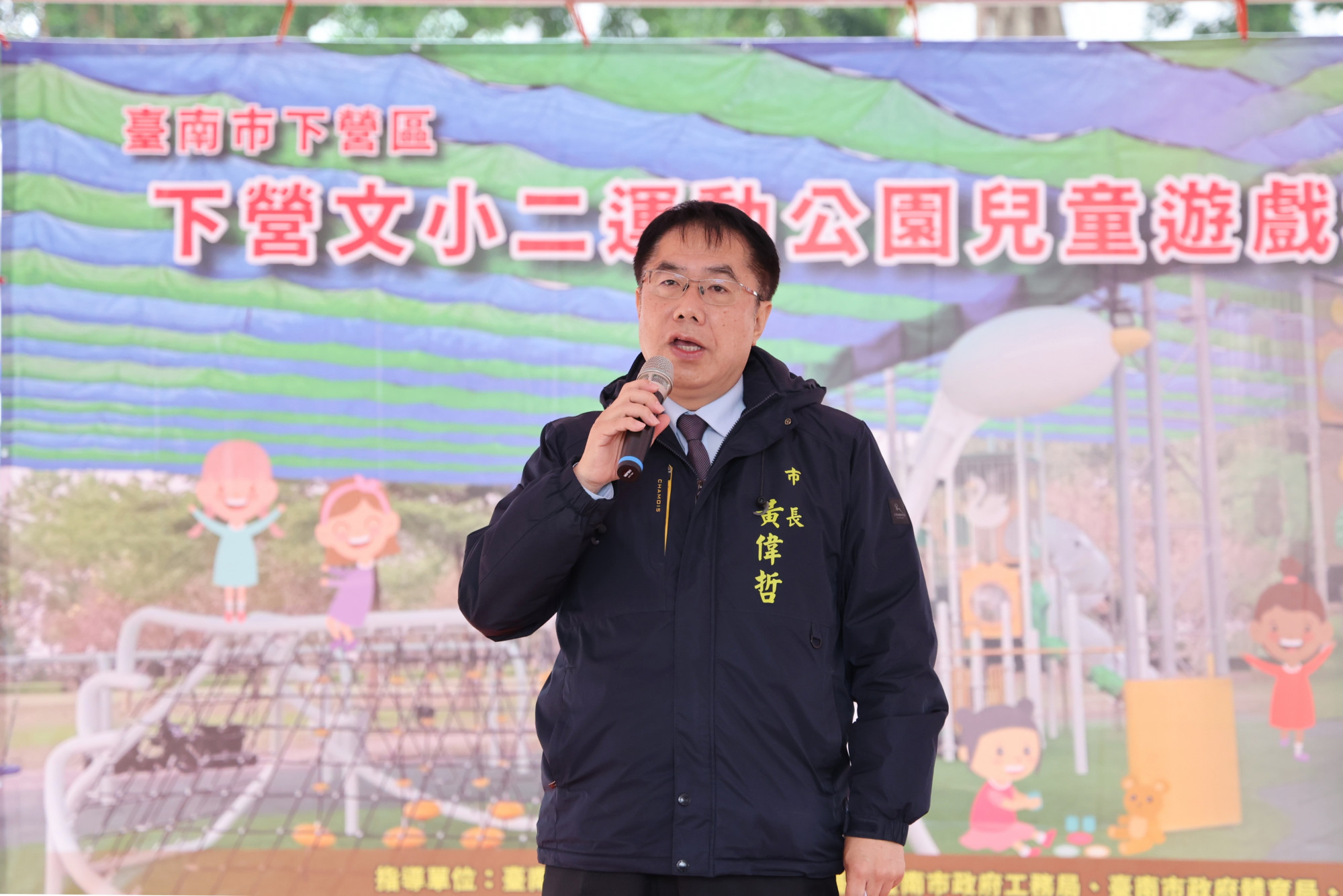 為提供下營區孩子們一個安全、有趣且富有創意的遊玩空間,臺南市政府打造下營文小二運動公園成為特色遊戲場,今(3)日舉辦遊戲場啟用儀式,臺南市長黃偉哲及議員尤榮智、陳秋宏皆到場共襄盛舉。這座遊戲場結合白鵝、紅桑葚、黑豆及白柚下營四寶意象,打造多項趣味性高、互動性強及舒適度高的遊具設施,可望成為溪北地區親子休閒遊玩的人氣景點。