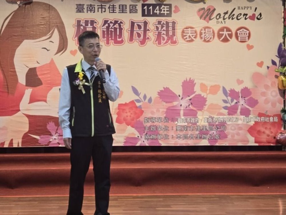 【記者田進山/台南報導】為慶祝5月母親節,佳里區公所提前於本(4)月26日 上午9時30分,於佳里區六里聯合活動中心舉辦「114年度模範母親表揚活動」。佳里區長林耿漢代表市長黃偉哲向辛苦的母親們獻上誠摯的祝福,並親自頒贈賀匾,藉由表揚活動,感謝終年勞苦功高的母親們對於子女、家庭及社會中所作貢獻,並祝賀佳節愉快。