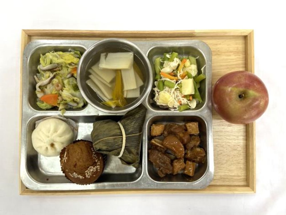 南新國中以金榜題名為主軸設計「包高中」午餐菜單,粽子象徵「包中」;好彩頭鮮筍蘿蔔羹湯代表「節節高升、好運連連」,香酥棒棒腿象徵「一舉成功」。整套餐點不僅美味更考慮營養均衡,幫助考生在備考期間補充能量、提振精神,也蘊含了廚房團隊滿滿的祝福,祈求每位學子順利考取理想成績。