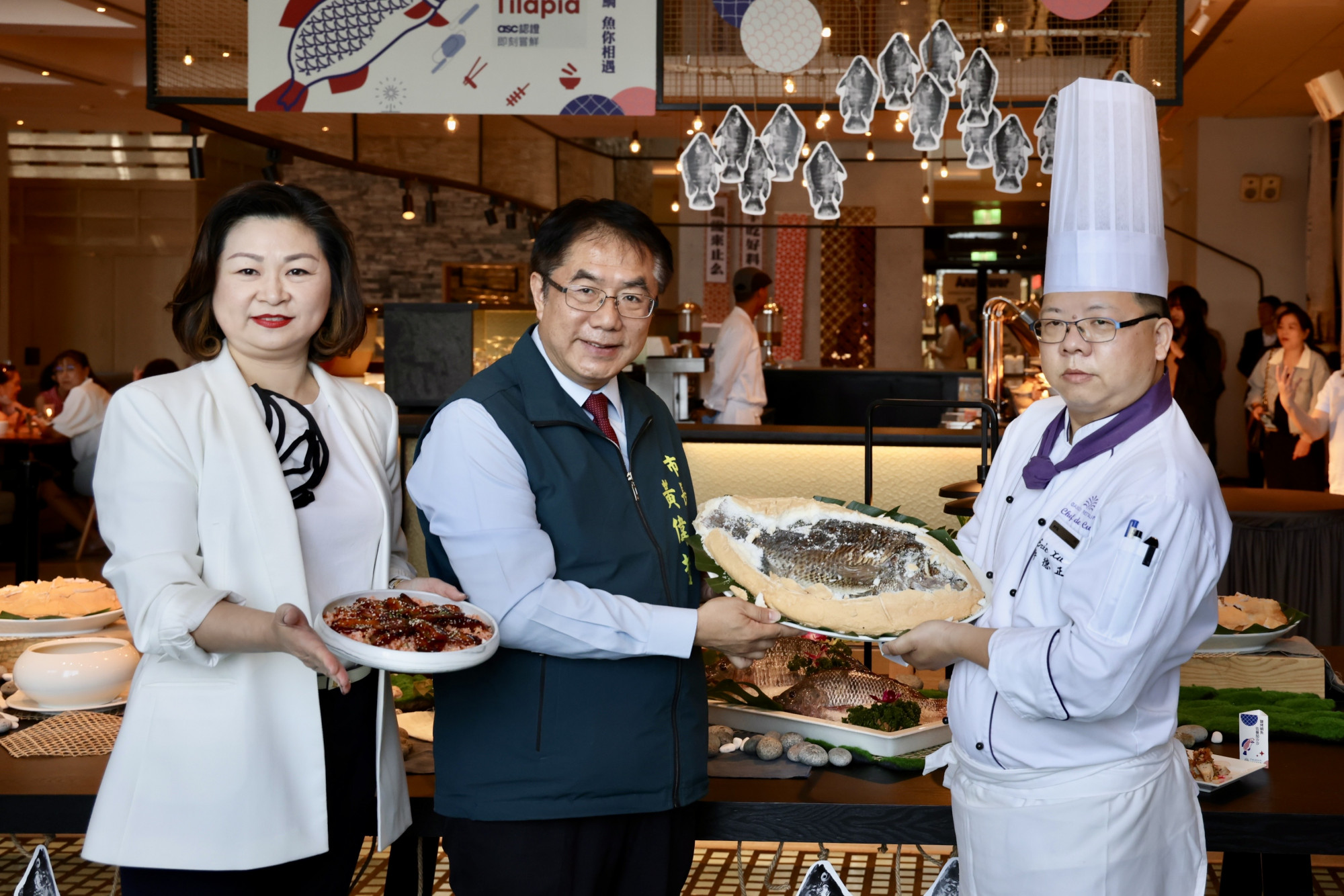 為加強行銷台灣鯛,降低關稅對產業的衝擊,南市府農業局與台南老爺行旅攜手合作,將於5月23日到6月1日推出「台灣鯛.魚你相遇」美食季活動,並全新推出8道台灣鯛料理。今(22)日下午於台南老爺行旅5樓甘粹餐廳舉行記者會,市長黃偉哲強調,台灣鯛是價格相當平民化的魚類,經過廚師的精心調製,變成多樣化的美食,歡迎大家來品嘗美味好吃的台灣鯛料理。