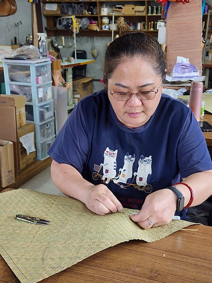 江姿錦說草蓆延展性與柔軟度不如布料,彎折方向受限,還得以蠟線縫製,相當考驗藝師的功力與手感,「針扎進去是牛皮還是人皮,要穿出來才知道」,生手常被戳得傷痕纍纍,可能一天還縫不好一個包。最近天氣炎熱,藺草編織的安全帽內襯因為透氣吸汗,一下子湧入近百張訂單,大家拚命趕工,背後支撐的是客人肯定帶來的成就感。可惜現在臺灣藺草產量稀少,只能改從越南進口藺草蓆半成品再設計加工。