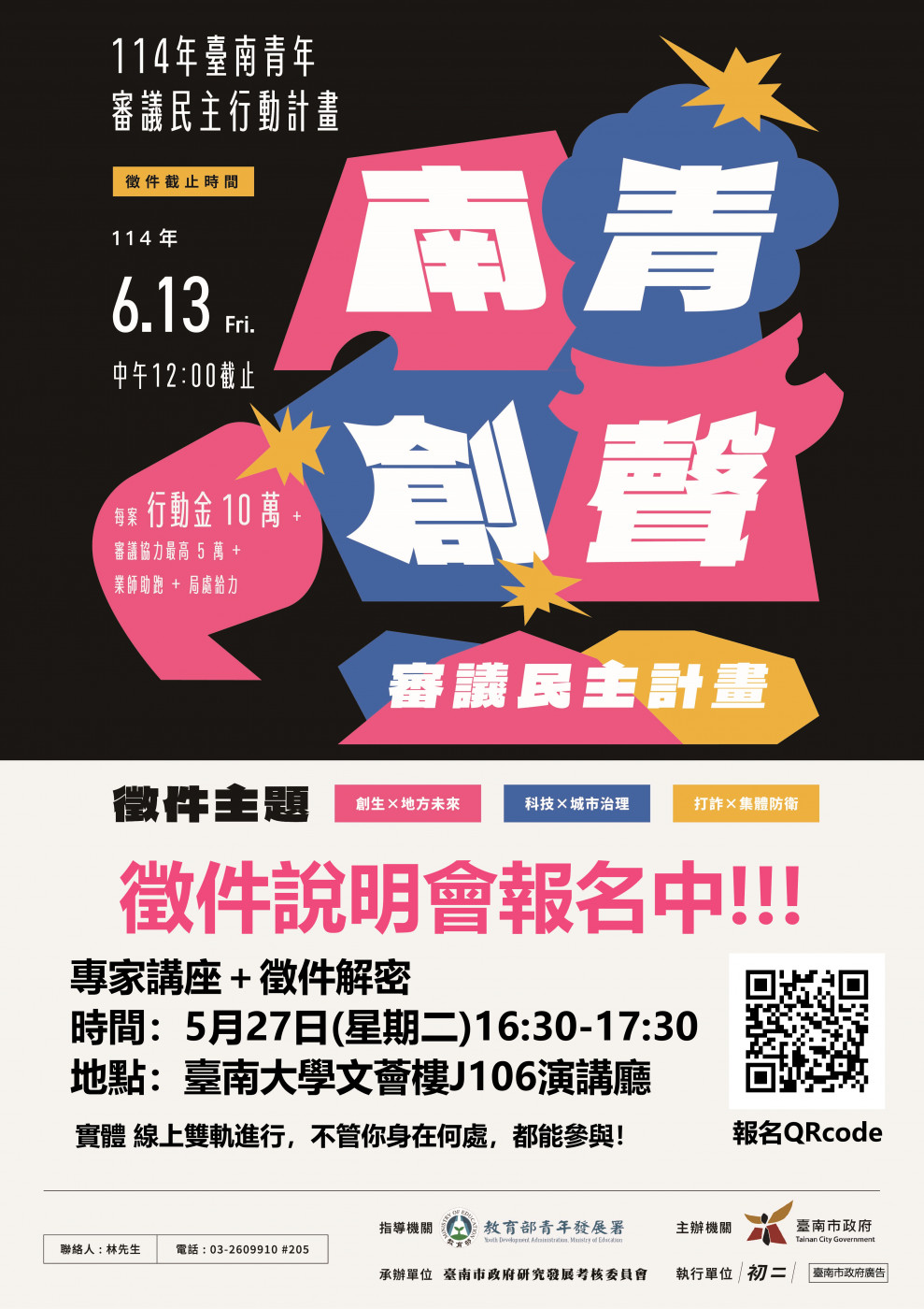 為鼓勵青年接棒參與市政、實踐審議民主精神,臺南市政府研考會將於5月27日假臺南大學文薈樓J106演講廳舉辦「臺南青年審議民主行動計畫徵件說明會」,活動提供實體與線上雙軌參與,誠摯邀請18至40歲設籍、就學或工作於臺南的青年朋友踴躍參加,共同探索如何以創新觀點參與治理、推動改變。