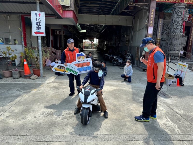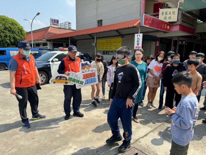 此次交安宣導先是利用室內宣講課程及有獎徵答讓同學對交通安全觀念有初步認識,隨後帶隊至海埔池王府進行大型車視野死角、內輪差及酒後駕車模擬體驗,一方面透過讓同學們分別登上駕駛座及站在視野死角,讓學生從不同角度去了解大型車視野盲點,並以氣球及交通錐模擬行人及機車,說明緊臨大型車因內輪差可能衍生後果,加深對大型車視野死角與內輪差潛在的危險認知;另一方面透過「酒醉情境模擬護目鏡」讓同學騎乘玩具摩托車及走直線,模擬酒醉後的感官,讓學生了解到酒醉後行車上路的不可控情況,同學們戴上護目鏡後都直呼「好暈哦!」,並紛紛表示酒醉後真的不宜駕車上路。