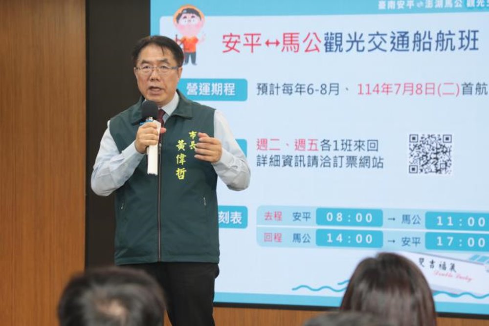 【記者廖啓舟/台南報導】暑假熱門旅遊旺季即將開始,為發展跳島旅遊多元遊程及拓展海洋永續觀光,台南市政府將於今(114)年7月8日開展台南安平至澎湖馬公觀光交通船航線,採取每週兩班固定航班,分別於週二與週五各1班往返,由安平港出發直航馬公港,全票原價1500元,試營運特惠價999元,半票600元。今(26)日舉辦活動宣傳記者會,市長黃偉哲表示,台南澎湖跳島遊程不僅可讓台澎兩地旅客往返多一項便利選擇,更可帶動海洋觀光新型態遊程的開發,非常歡迎國內外旅客一起來體驗暢遊。