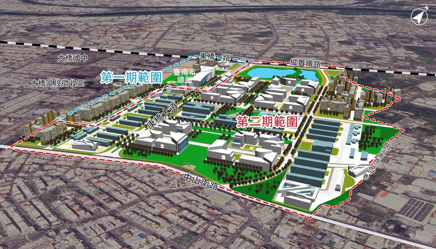 黃偉哲市長指示地政局強化與地方溝通,導入參與式規劃設計,規劃符合市民需要的公園。二期開發範圍依都市計畫規劃有經貿複合專用區(約15.7公頃)、創意設計園區專用區(約13.26公頃)、生活服務專用區(約6.06公頃)、公園用地(約14.61公頃)及其他公共設施用地(如:機關用地、道路用地、停車場用地等,共計約19.37公頃)。其中公園用地(含公兒用地):公園兼滯洪池(7.98公頃)、公14-1(2.292公頃)、公14-2(0.702公頃)、公14-3(2.172公頃)及綠園道等景觀綠地,公園綠地總面積超過15公頃。陳淑美局長表示區內大面積不可多得的公園貫穿中央軸帶南北方向,全長約1公里,預計規劃一座兼具歷史記憶、生態功能與社區共同參與的中央軸帶特色公園,公園主體保留區內原有大樹,營造多樣化棲地,並設計滯洪池等設施,兼具排水與生物棲息功能。另外園區內將規劃綠園道、共融遊具、活動大草原、寵物公園與創意廣場等設施,並結合砲校意象特色元素以及旗鑑型森林冒險體驗空間,轉換原來軍校基地生硬印象,打造大型的都市綠帶環境,提供永康大橋及東橋一帶居民休閒遊憩的需求。