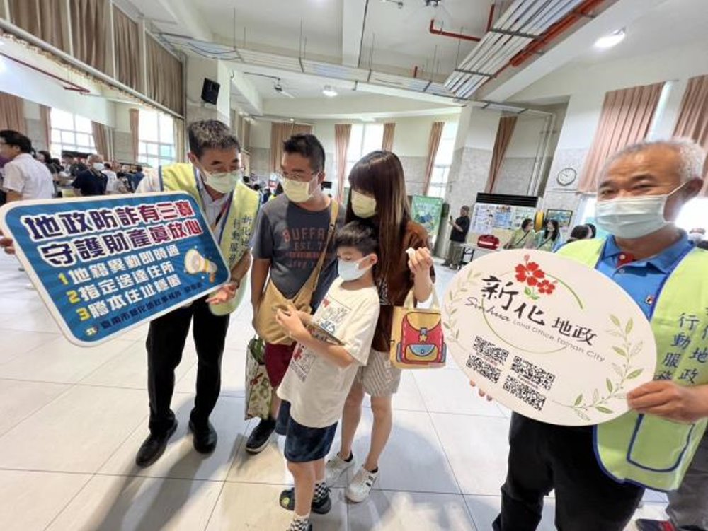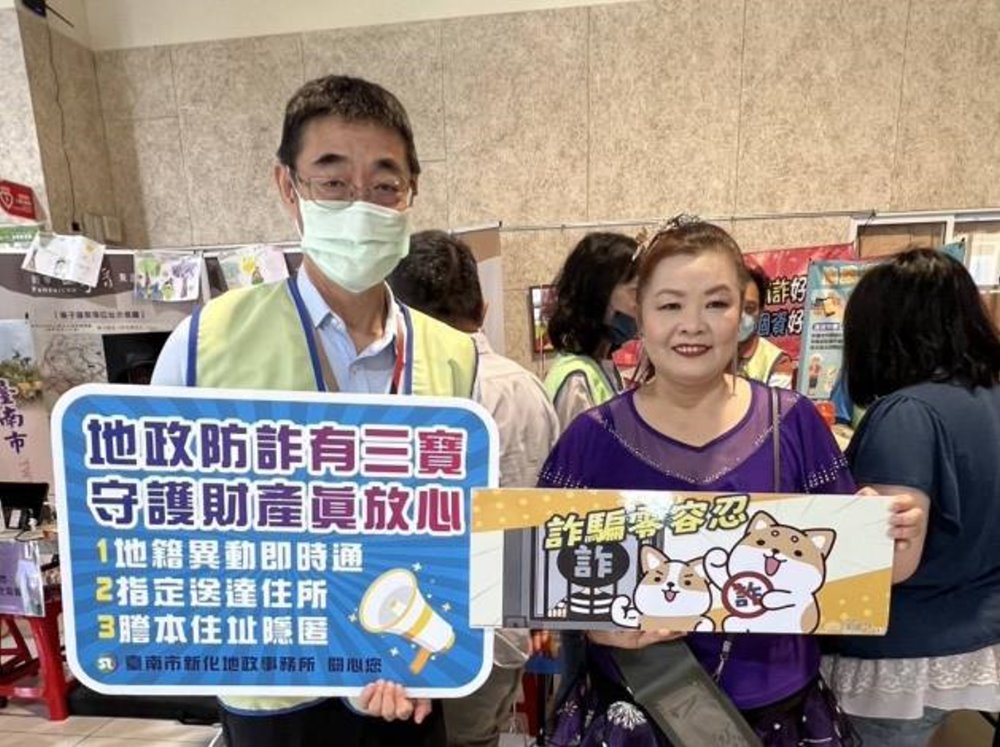【記者黃石泉/台南報導】依據內政部警政署統計臺南市5月詐騙案件受理數從4月的1,232件增加到1,299件,為六都增加最多。為合力協助民眾守護財產安全,新化地政事務所於6月28日結合轄區內新市白蓮霧節─「閃耀綠寶石傳說」產業文化活動設攤宣導,本次宣導主軸「防詐三寶」—地籍異動即時通、住址隱匿、指定送達處所,以及推廣電子產權憑證、地籍存摺等地政服務,現場提供地籍異動即時通申辦服務,並設計轉轉圓盤活動與民眾互動,加深民眾的不動產防詐觀念,提高地政便民服務的能見度。