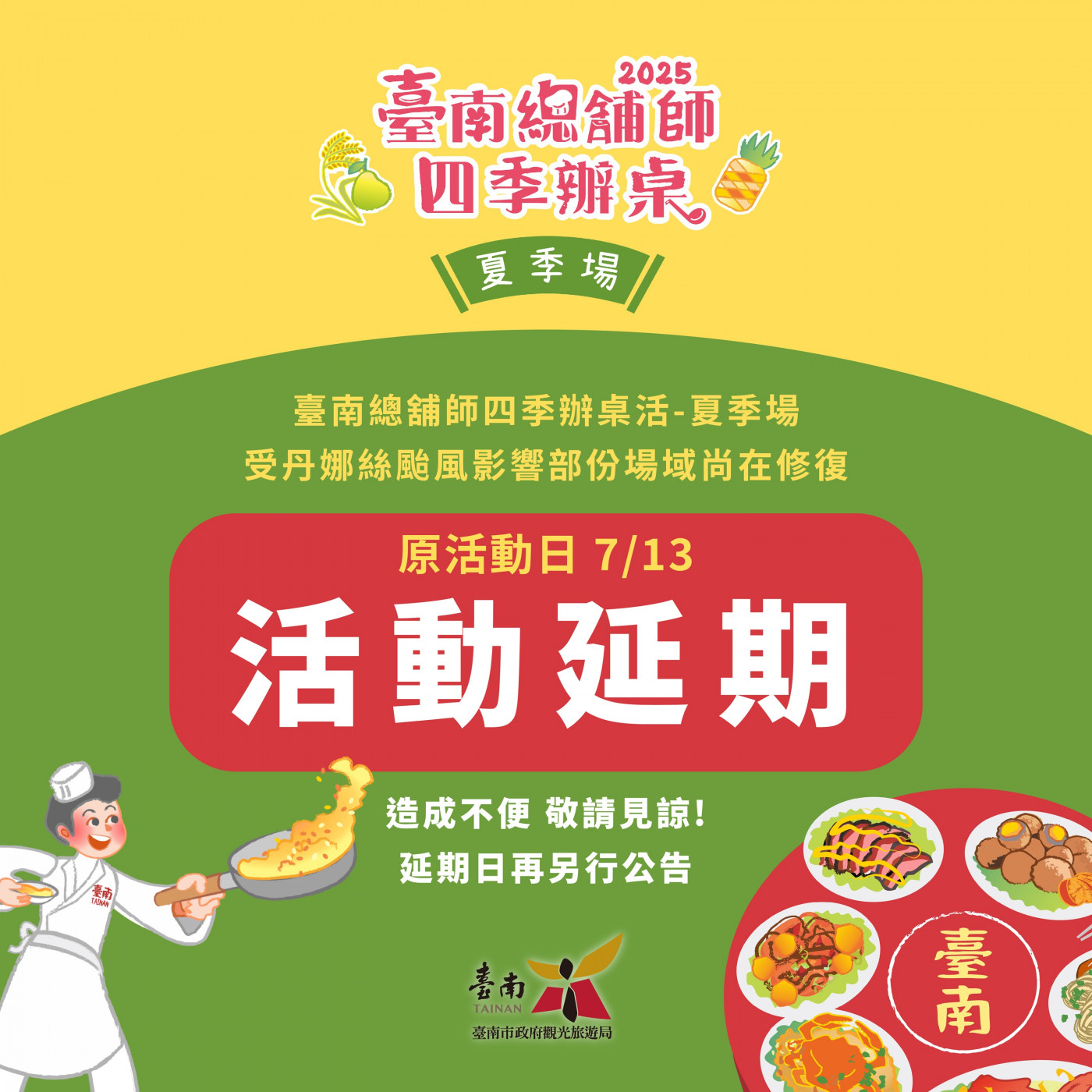 《臺南總舖師四季辦桌‧夏季場》延期舉辦(原訂7/13辦理,延期另行公告)