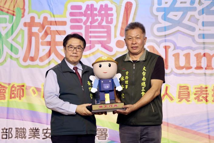 黃偉哲指出,今年7月丹娜絲颱風造成中南部地區許多房屋毀損,勞工局「做工行善團」迅速結合各修繕相關工會、企業在颱風重創後立即投入重建,協助災民恢復居住安全。因此今日頒發「做工行善讚」工寶造型獎座予勞工局輔導成立的「希望家園安衛家族」等單位,並感謝「希望家園安衛家族」核心企業大台南總工會結合各大工會修繕志工組成做工行善團以及「安心舜力安衛家族」核心企業─新舜營造公司、「營造業安衛家族」核心企業─大成工程股份有限公司及彰化金主營造公司、營造業南區職業安全衛生促進會,肯定這些單位熱心投入災後重建工作,成為支撐災民度過難關的力量。