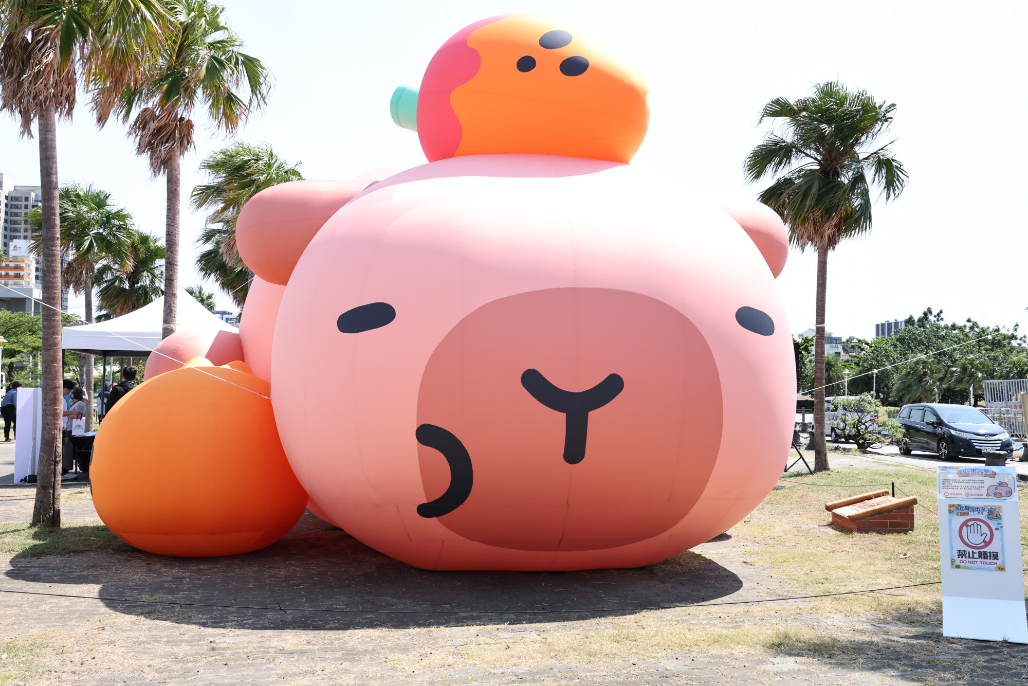 首次登陸安平漁人碼頭的12米高「卡比胖拉」,以經典慵懶泡湯造型現身,手抱青皮椪柑