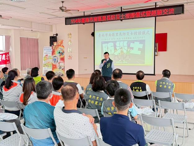 【記者黃石泉/台南報導】台南市南區區公所今(22)日上午舉行「南區里長防災士授證儀式」,南區37位里長全數完成防災士培訓,今日在臺南市政府民政局局長姜淋煌、災害防救辦公室參議王雅禾及區長蕭琇華共同見證下進行授證儀式,象徵南區在推動社區防災韌性、強化災害應變體系上邁入新里程碑。