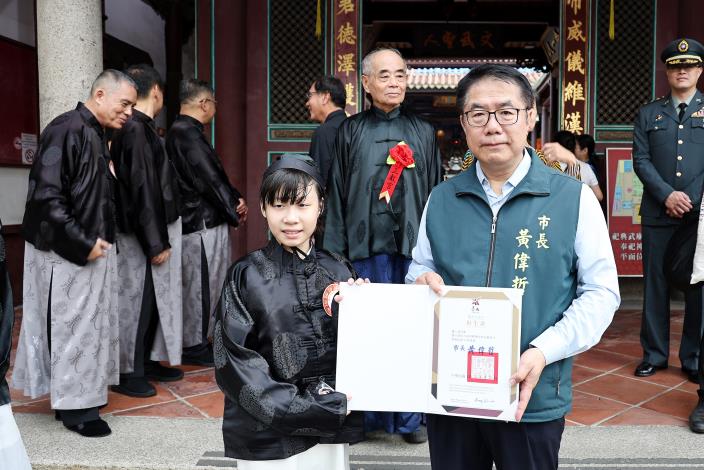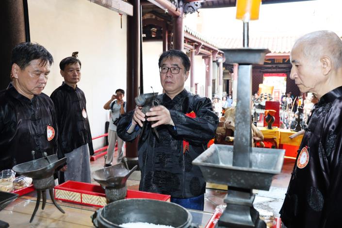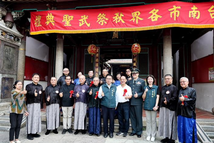 今日儀式依循古禮進行,祭典依啟扉、排班、班齊、執事者各執其事進行,黃偉哲市長偕同與祭人員行初獻禮、亞獻禮、終獻禮以及分獻禮等流程,向武聖關公致上崇高敬意。