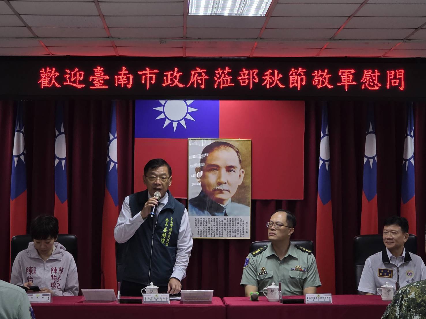 市長黃偉哲致詞時表示,中秋是闔家團圓的節日,但國軍弟兄姊妹仍堅守崗位,令人敬佩。他特別感謝部隊在日前丹娜絲颱風來襲時,第一時間投入救災與安置工作,展現「平時為民、戰時為國」的精神與高度效率,讓市民倍感安心。平日國軍在防救災、防疫及維護社會安全等方面的專業與奉獻,市府與市民均銘記於心。