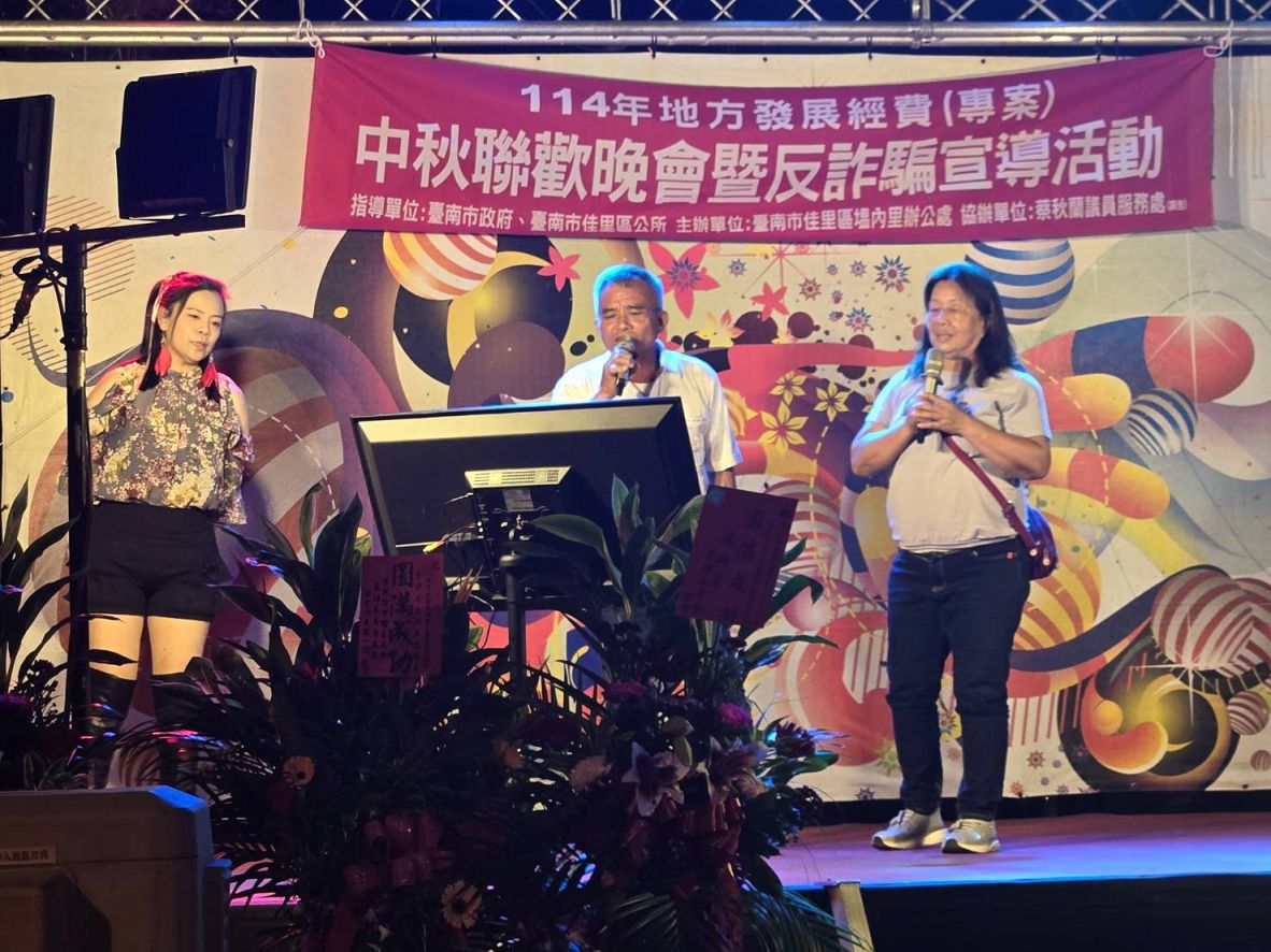 台南市政府警察局佳里分局反詐騙宣導團由巡佐許智惠協同偵查佐吳哲維等人於現場作「165反詐騙儀表板宣導民眾受騙實例解析」、落實中秋優良政風及反貪腐廉政倫理案例、反酒駕及「防治家庭暴力」等婦幼安全常識宣導,籲請在場來賓牢記防詐3步驟,1聽、2掛、3查證,善用165反詐騙專線查證諮詢,避免受詐騙危害。