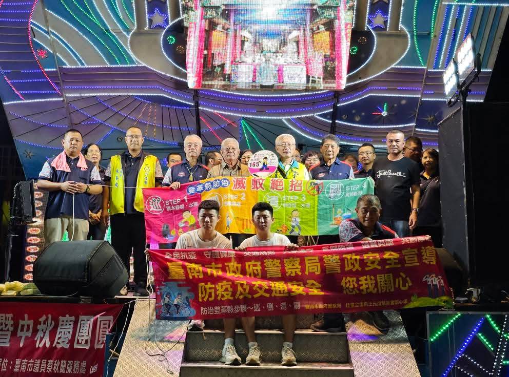 台南市政府警察局佳里分局反詐騙宣導團由偵查佐吳哲維等人於現場作「165反詐騙儀表板宣導民眾受騙實例解析」、落實中秋優良政風及反貪腐廉政倫理案例、反酒駕及「防治性騷擾及反家庭暴力」等婦幼安全常識宣導,籲請在場來賓牢記防詐3步驟,1聽、2掛、3查證,善用165反詐騙專線查證諮詢,避免受詐騙危害及善用113全國婦幼保護專線,確保婦幼安全。