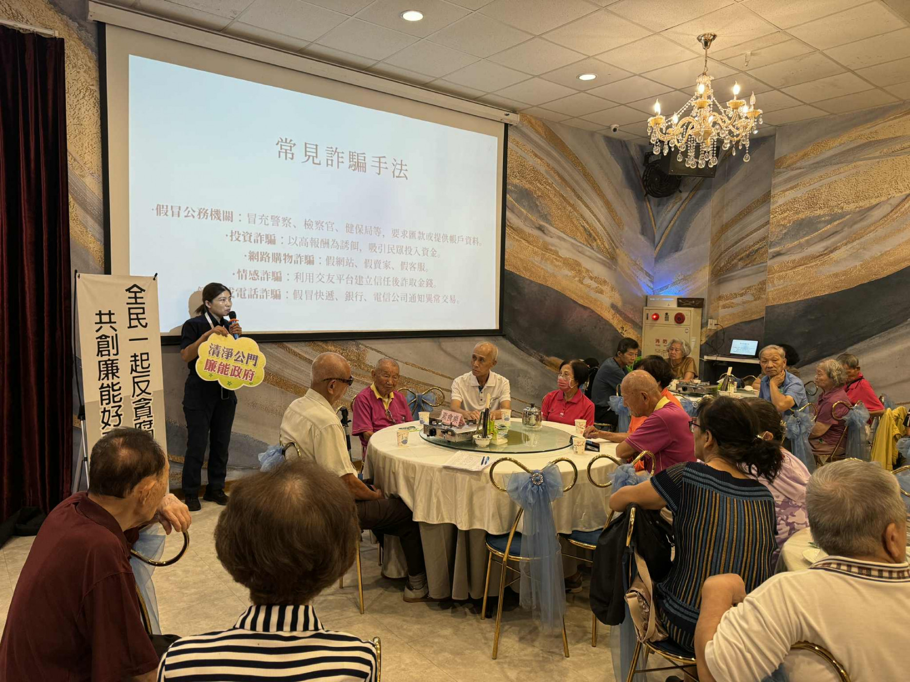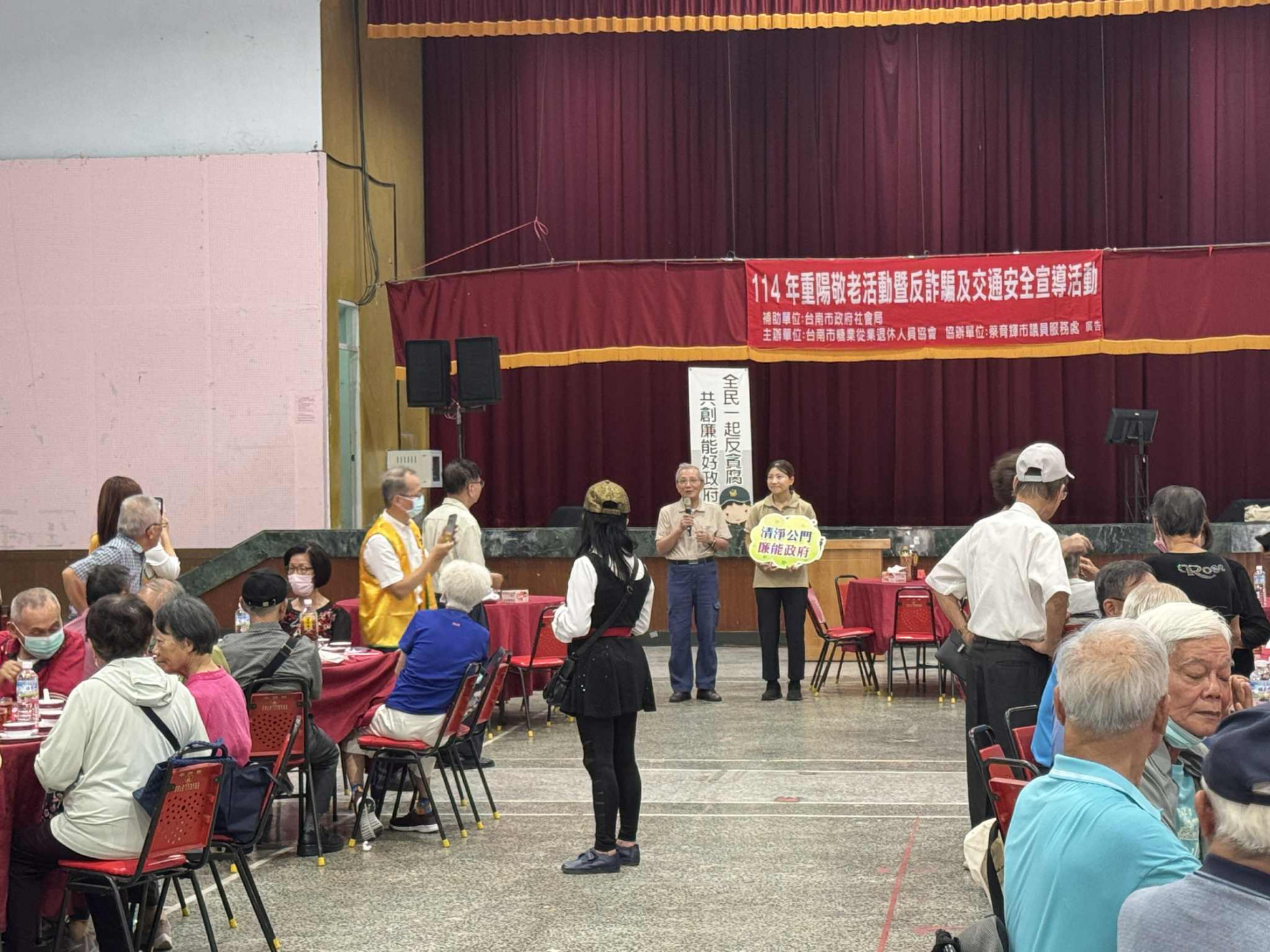 114年農曆九月初九適逢國曆10月29日,新營分局轄區不少高齡長者社群選擇在這天前後日期舉辦重陽敬老活動,新營分局為了強化高齡長者自我防詐意識並灌輸交通安全暨反貪觀念,特地至各敬老活動場合加強宣導,由第一線基層員警黃凱琳分享實際受理詐騙案件,警惕高齡長者在接到陌生來電時務必做到「一聽、二掛、三查證」的動作以保護自我,並配合時下流行的「上車舞」舞蹈動作帶動唱,現場氣氛活絡,會中另宣導交通安全法規及公務員廉政倫理規範相關規定,強化高齡長者法令觀念。