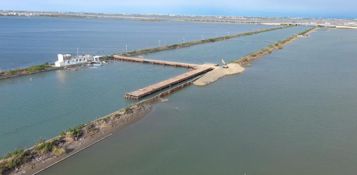 此外,丹娜絲颱風過後,為協助沿海聚落抵禦暴潮侵害,水利局於最短時間內緊急完成多項加高防護措施,包含七股區西寮社區防洪牆加高600公尺、將軍區青鯤鯓社區防洪牆加高400公尺,並於七股區鹽埕里建構三道總長達2,000公尺的防潮工程(包含大寮排水堤岸緊急搶修200公尺、市道176線路堤加高900公尺及鹽田土堤田埂加高加固900公尺),有效抵禦楊柳颱風及天文暴潮的雙重威脅。為進一步降低暴潮衝擊風險,亦積極投入1,900萬元推動青山港汕沙腸袋工程,緊急完成搶修施作沙腸袋850公尺,藉由沙洲復育抵禦颱風暴潮巨浪並防止海水沖入七股聚落,可大幅提升西寮、鹽埕等社區居民生命財產安全。