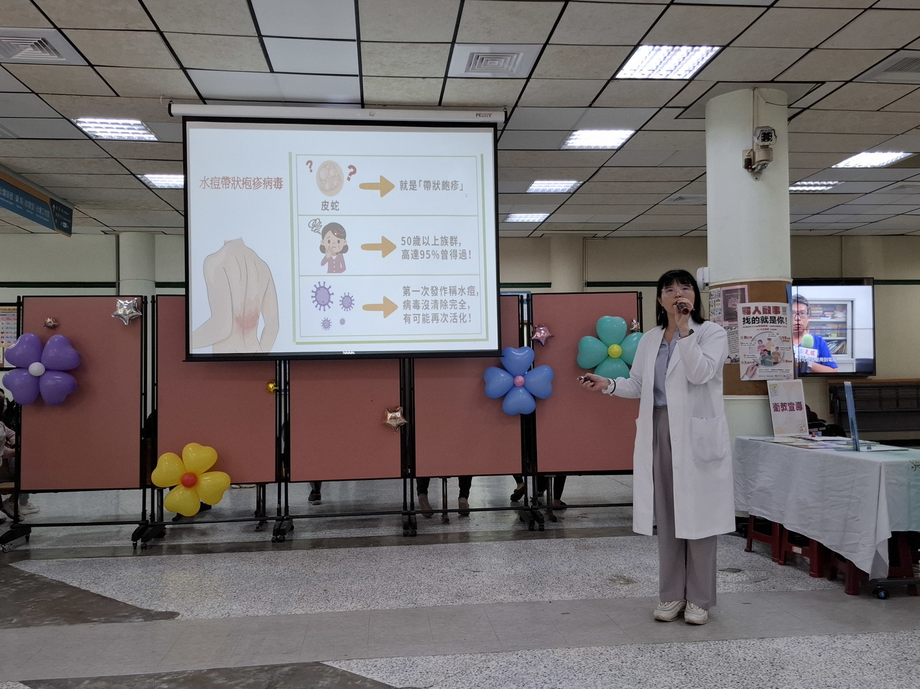 而家醫科翁靖惠醫師則向民眾介紹帶狀皰疹的成因、常見症狀(如單側皮節疼痛、水泡等)及可能引發的皰疹後神經痛、視力或聽力受損等併發症,並強調早期治療的重要性。翁靖惠醫師提醒,秋冬轉涼,呼吸道疾病增多,免疫力下降可能讓潛伏的帶狀疱疹(俗稱「皮蛇」)伺機發作,高風險族群如年長者、免疫不全者、慢性病患者,可藉由良好作息與健康生活方式提升免疫力。此外,接種帶狀皰疹疫苗有助於提升完整保護力,降低感染與併發症風險,民眾可至新營醫院家醫科接種。