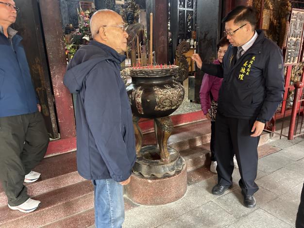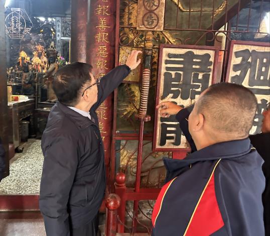 【記者黃石泉/台南報導】台南市北區全臺首邑縣城隍廟遭不明人士破壞法器文物設施一案,市府民政局長姜淋煌於今(1/9)日代表黃偉哲市長前往縣城隍廟,向主任委員黃百榮關心受損現況,並表達市府對本案之高度關切。