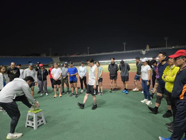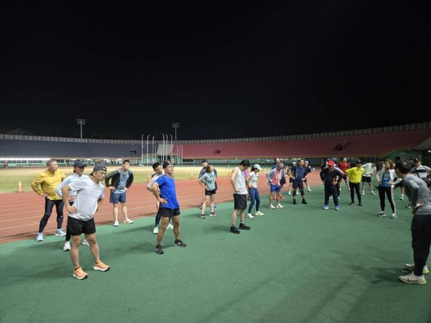 【記者田進山/台南報導】「2026臺南古都國際半程馬拉松」迎來20週年里程碑,賽事將於2026年3月1日(星期日)在臺南市政府永華市政中心南島路盛大舉行,臺南市政府跨局處一起以行動支持古都馬,昨(14日)晚林榮川副秘書長、徐健麟副秘書長、市長室林唯莉秘書、主計處李錫東處長、客家事務委員會陳新裕主任委員、體育局陳怡平人事主任齊聚臺南市體育場參與賽前訓練,不僅能提升心肺功能及肌耐力,也能提升跑步知能,避免運動傷害,讓大家能夠朝著心中設定的目標邁進。