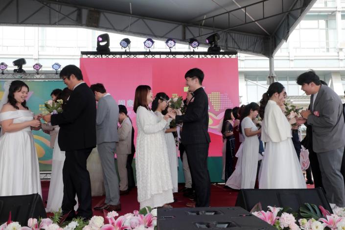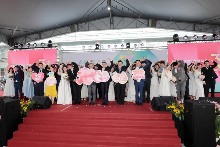 卓院長說,很高興在南科30週年之時,見證66對新人集團結婚,完成人生一個重要里程碑,象徵南科不僅孕育高科技產業,也是孕育幸福的所在。他指出,政府將經濟成長成果回饋全民,持續推動「0到6歲國家一起養」政策,今年相關預算編列達1,136億元,透過托育補助與公共資源挹注,減輕年輕家庭負擔,讓願意生、養得起,成為支持少子化對策與世代永續的重要基礎。最後,他祝福新人以經營園區的精神經營家庭,幸福長久。