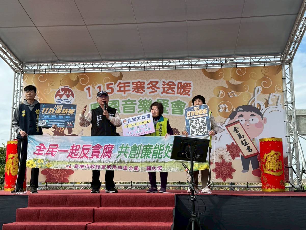 南市七股區公所舉辦「寒冬送暖歲末音樂餐會」活動,佳里警分局到場作反詐騙宣導。