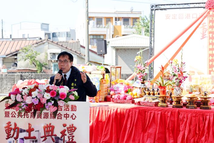 黃偉哲致詞表示,本案總經費1億餘元,其中由中央補助5,300萬餘元,剩餘的4700萬則由市府自籌,透過社會局編列預算推動,展現中央與地方共同投入、攜手建設地方的決心。他感謝建築師與營造團隊在短時間內完成設計、順利推動工程開工,並期盼工程能「順順做、好好做」,避免不必要的設計變更與追加經費,在確保品質與安全前提下,讓建設如期完成,早日回饋市民使用。