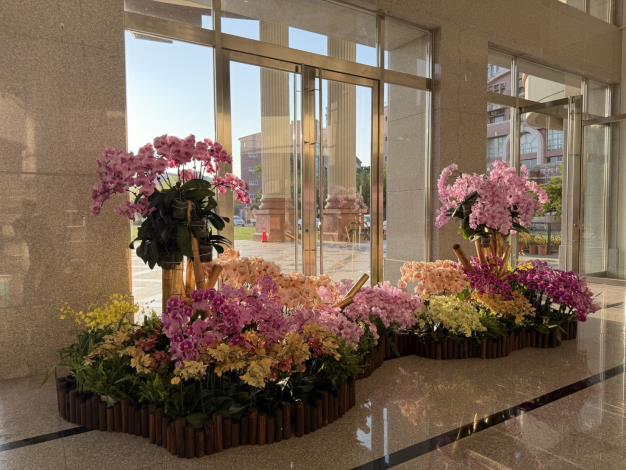 秘書處黃處長指出,此次花藝佈置以蘭花之雅,鋪陳迎賓之境,透過流動線條與層次堆疊,展現空間的溫度與城市的生命力,整體設計利用柔和的曲線和不同色系蘭花(紫、白、粉)高低交錯配置,除了呈現出豐富的層次感外,弧形流動效果更營造出如微風拂過花海的動態感,圍邊素材以木頭圍籬結合綠葉鋪底,使整體景觀更貼近自然生態,歡迎民眾來洽公之餘,也能駐足觀賞,拍照留念。