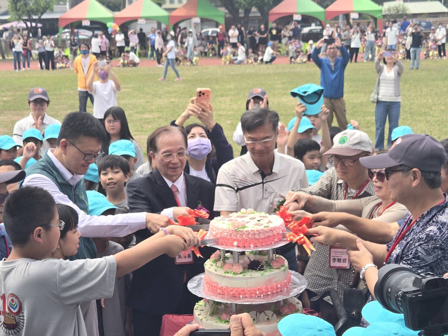 圖:校長黃三和及前部長吳清基等來賓共切三層生日蛋糕