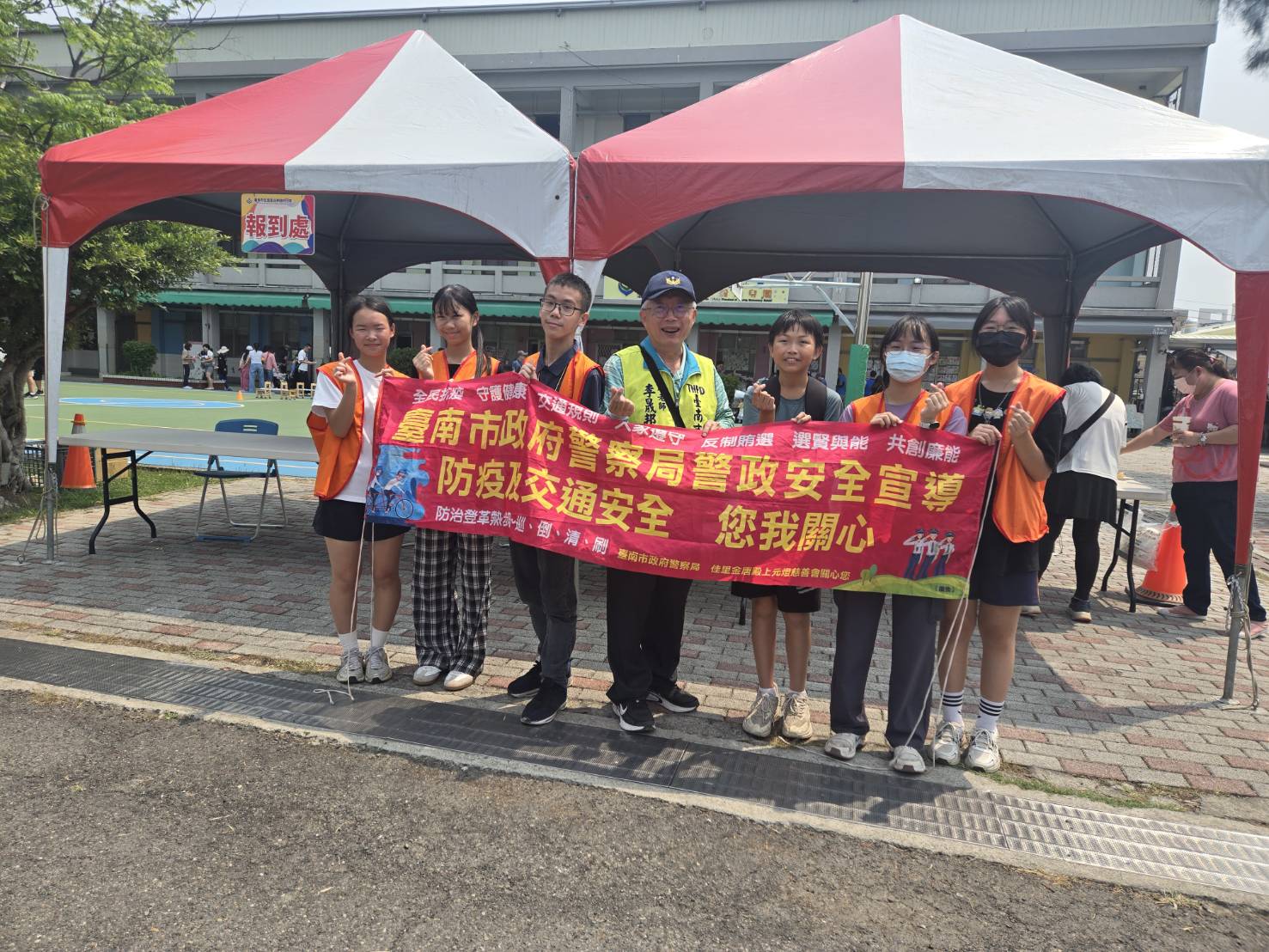 台南市政府警察局路老師李晟邦警官及志工也到場宣導登革熱防治四大步驟-巡、倒、清、刷,杜絕病媒蚊孳生,以確保市民健康安全。並融入有獎徵答議題,強力宣導防疫安全、廉政倫理規範及酒後勿開車,確保用路人安全及「1959」全國動物保護專線功能與