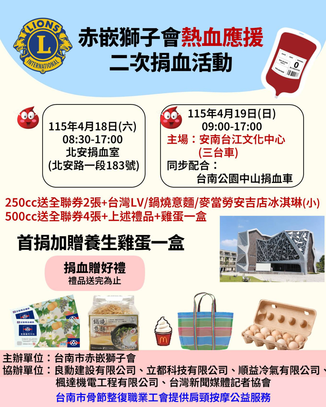再度熱血出擊!台南市赤嵌獅子會第2次捐血活動 4/18、19號召市民挽 袖救人