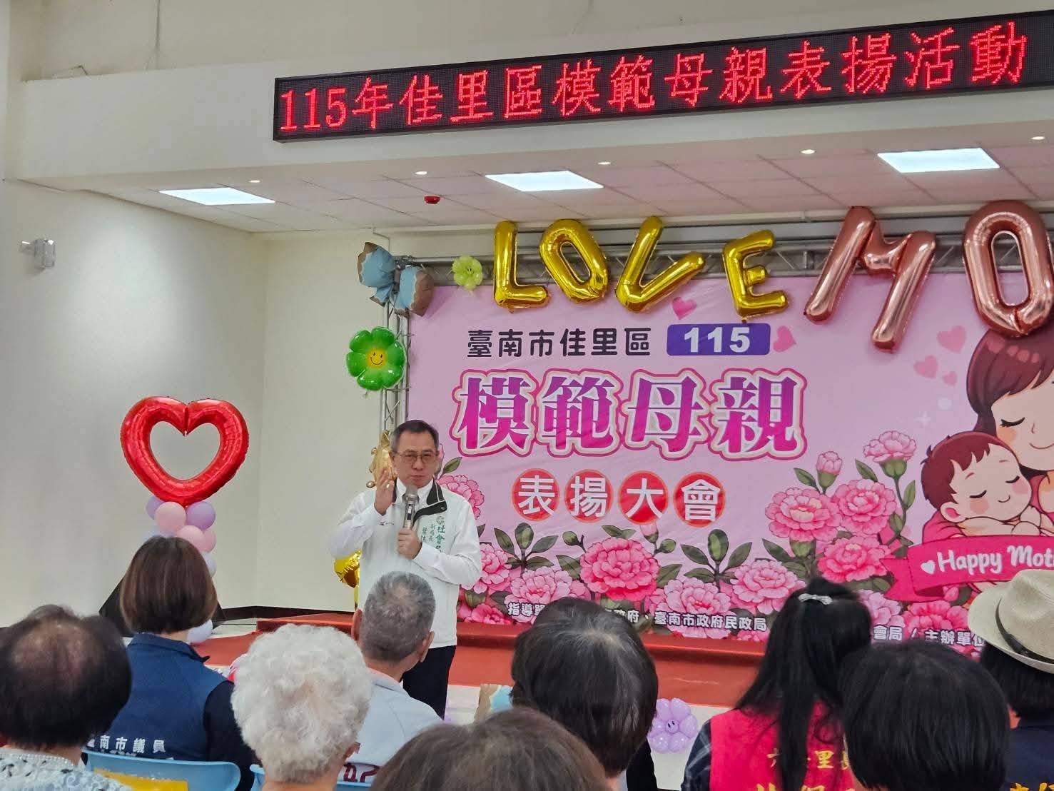 【記者田進山/台南報導】為提前慶祝5月份光輝的母親節,佳里區公所於本(4)月25日(星期六)上午9時30分,假佳里區第二聯合活動中心舉辦「115年度模範母親表揚活動」。佳里區長林耿漢代表市長黃偉哲,向辛勞付出的母親們獻上最誠摯的祝福,社會局副局長葉誌明亦到場同賀。藉由公開表揚,感謝母親們長年對子女、家庭及社會的無私奉獻,並祝福大家母親節快樂。