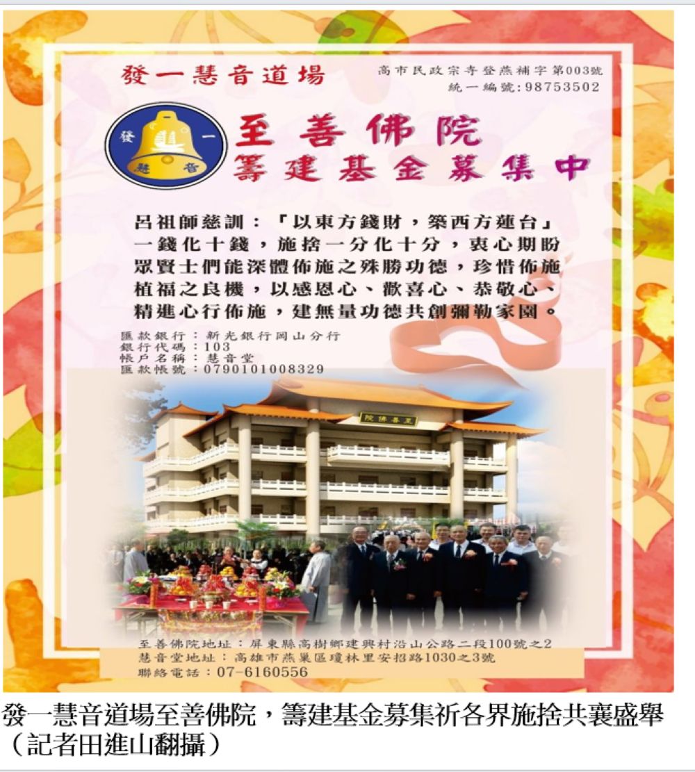 發一慧音道場至善佛院,中華慧音品格人文發展協會以慈悲喜捨出來為大眾服務,岡山慧音堂隨著道務持續發展,道親人數逐年增加原有建築不敷使用,原本尚可容納之空間,難以承戴日益頻繁之法會,開班與教化活動道場發展遂由「可用」邁入「不足」之臨界階段,有感需要更可用的道場,人有善願天必從之,在屏東高樹沿山公路旁建設至善佛院,蓋七,八,年至今未完成,然所需經費為龐大,僅靠慧音堂全體道親財力經費有力而不足,王江宏大德聽到信息,馬上發心捐1萬伍仟元,他謙虛說微薄小小力量而已,能力有限微不足道僅能抛磚引玉,能集大眾之力慷慨捐輸,期能涓滴成河聚沙成塔,齊力早日完成建廟之聖事,盼四面十方大德共襄盛舉,感恩您的支持銘謝衷心,同時也感謝從事健身教練兼聖善歌歌手吳東湟大德,時常在群组義賣素料,向粉絲募款捐助蓋至善佛院,佛家一文錢大似須彌山,募捐二者功德無量,懿德善行可為社會表率。