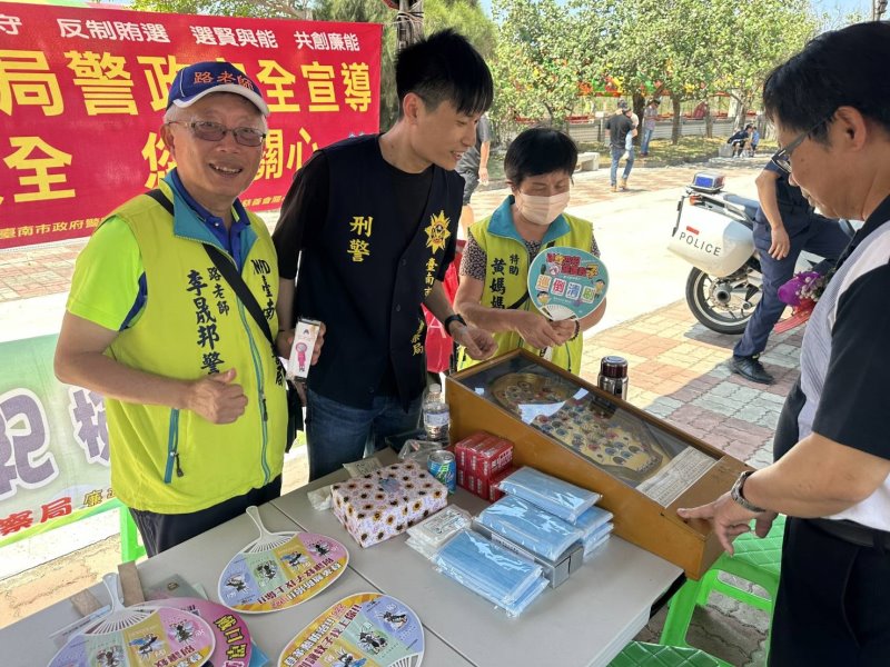 反詐騙宣導團由巡佐許智惠偕同偵查佐吳哲維及志工紀杜秀晚、陳阿麗等人於現場作「假投資真詐騙案例」、優良政風、反酒駕及「路口安全及精準執法」等交通安全常識宣導,籲請在場來賓牢記防詐3步驟,1聽、2掛、3查證,避免遭騙受害,行經路口確實遵守慢、看、停原則,養成不酒後駕車、不超速、不闖紅燈及遵守各項交通法令,以確保生命財產安全,另警察局政風室宣導科員及行政科路老師李晟邦警官也以廉政案例及宣導「1959」全國動保專線與預防環保案件犯罪為題,以彈珠台闖關遊戲融入有獎徵答議題,並加強宣導動保及環保案件策略具體作法與現場來賓熱烈互動,宣導效果良好。