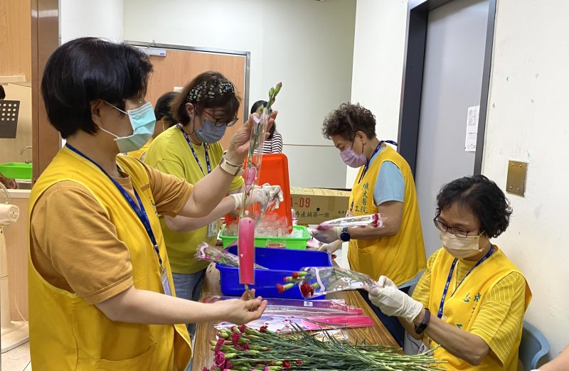 母親節送花祝福暨關懷活動已成為成大醫院志工團隊的傳統,今年分贈的大批康乃馨鮮花及材料,由「大安森林公園之友基金會」副執行長陳鴻楷先生,及本院資深志工林莊麗珠女士熱情贊助,再由熱心志工夥伴分工修剪及包裝。
