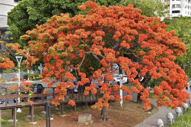 公園處補充,鳳凰木是蘇木亞科的多年生落葉大喬木,適合生長於全日照且溫暖的環境,是城市常選用的行道樹種類之一。夏季高雄的街頭、校園、綠地,金黃的阿勃勒及印度紫檀、浪漫的大花紫薇與艷麗華美的鳳凰木相互輝映,市容景觀精采紛呈,奼紫嫣紅的行道樹花毫不吝惜地裝飾著城市每個角落,歡迎市民朋友走出戶外感受花團錦簇的美好。