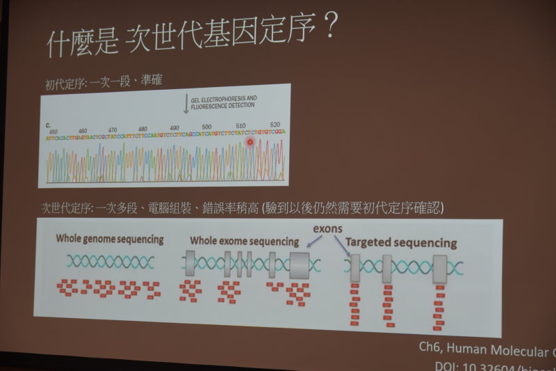 成大醫院神經部暨基因醫學部林伯昱醫師說明,傳統的初代基因定序一次只能定出一個片段的DNA序列,相較之下,次世代基因定序是將DNA分子分割成很多片段,然後同時進行很多個片段的定序,產生大量的基因片段序列數據,再由電腦計算進行組合,產生完整的基因序列。次世代基因定序的好處,是一次可以看很多的基因,而缺點則是定序的錯誤率比初代定序要高,因此次世代定序的檢驗結果,需要用初代定序再次確認,才不會造成臨床誤判。