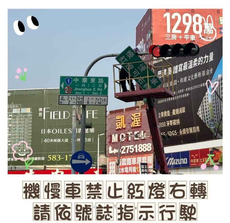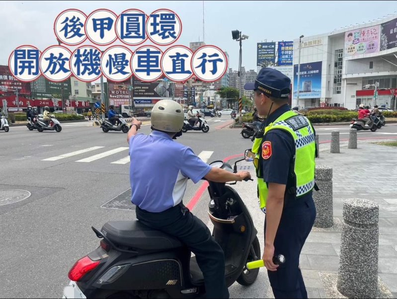 南市交通局原宣布後甲圓環因取消紅燈右轉、開放機車僅准直行穿越,可能造成用路人短時間無法適應的問題,該局原訂至今年5月31日前,如因後甲圓環管制措施改變,而衍生的違規項目(如圓環機慢車違規紅燈右轉)將以勸導為主,嗣經交通局近期觀察,並於今年5月31日與相關單位現場會勘,決議將優化後甲圓環相關交通設施,如設置輔1標誌、車道終止標字等相關交通設施,以預告用路人前方路口車道佈設情形。