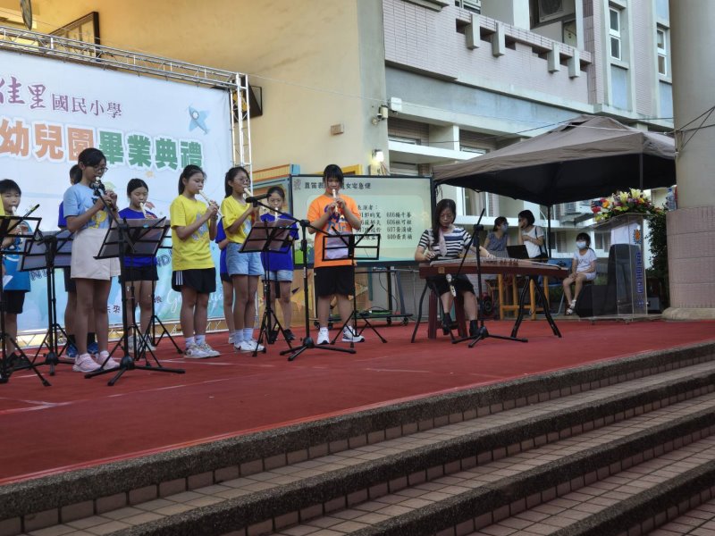 本次典禮在畢業生蘇郁夫等12位小朋友以直笛表演「魔女宅急便」及黃睿翧表演舞蹈-「水蓮花開」的才藝表演與畢業生大合唱畢業歌-「往未來飛的客機」及「OwlCity-Vergeft.AloeBlace」<在人生不同階段的交界處>,嘹亮的歌聲中,互道珍重再見。