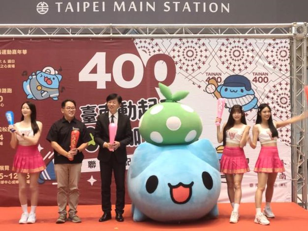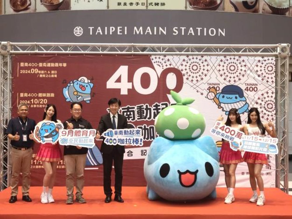 「臺南動起來,400咖拉棒!」400年一度,集結嘉年華、馬拉松和棒球展的運動盛會,9月即將熱鬧開場!為號召全國民眾來到臺南參加臺南400專屬體育盛事,今(14)日市府特別來到臺北車站一樓多功能展演廳舉辦聯合記者會,由統一獅啦啦隊的瑟七、JOY及艾璐帶來活力滿分的啦啦隊表演,為活動揭開序幕。今年臺南不僅主辦8月「臺灣文博會」和10月「臺灣設計展」,更用行動力挺在地文創IP,找來超人氣的「貓貓蟲咖波」代言,今天咖波也在舞台旁跟著音樂手舞足蹈;邀請大家跟著貓貓蟲咖波動起來,一起來森巴臺南啵!