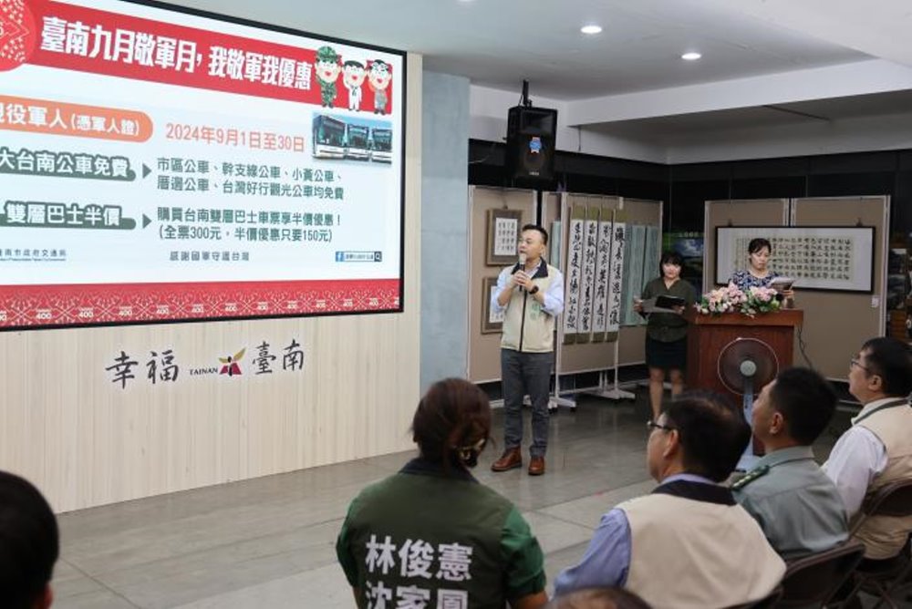 臺南市政府表示,去(112)年首度推出臺南九月敬軍月,引起廣大迴響,今(113)年號召了更多場館及店家加入優惠,要向國軍表謝意。議員蔡育輝、沈家鳳、臺南市後備指揮部指揮官上校宋自強,皆到場表示關心。
