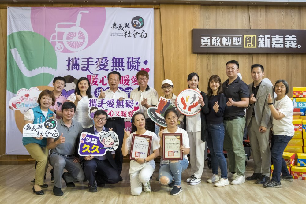 嘉義縣政府今16日舉行「攜手愛無礙 暖心也暖愛」捐贈儀式,由縣長翁章梁接受捐贈,並回贈感謝狀,答謝貢獻公益的善心人士們,受贈單位包括3家身障福利機構、8家身障團體及嘉義縣輔具資源中心,輔具中心今年也於民雄綜合社會福利館成立第二處中心,提升服務近便性。