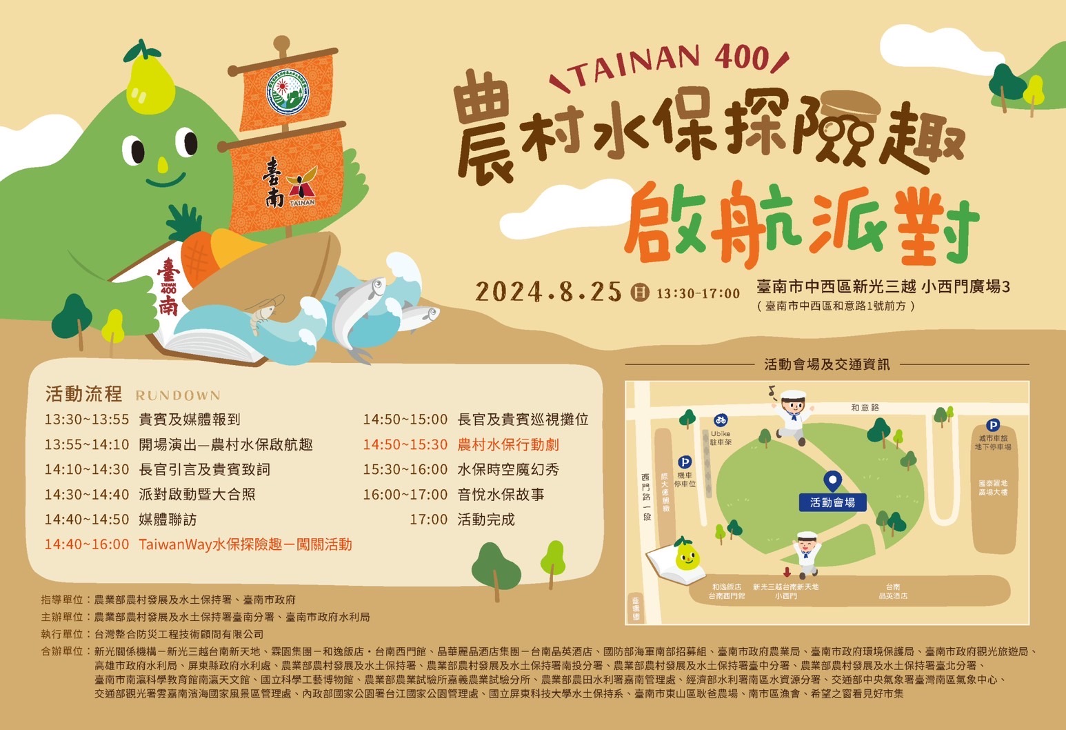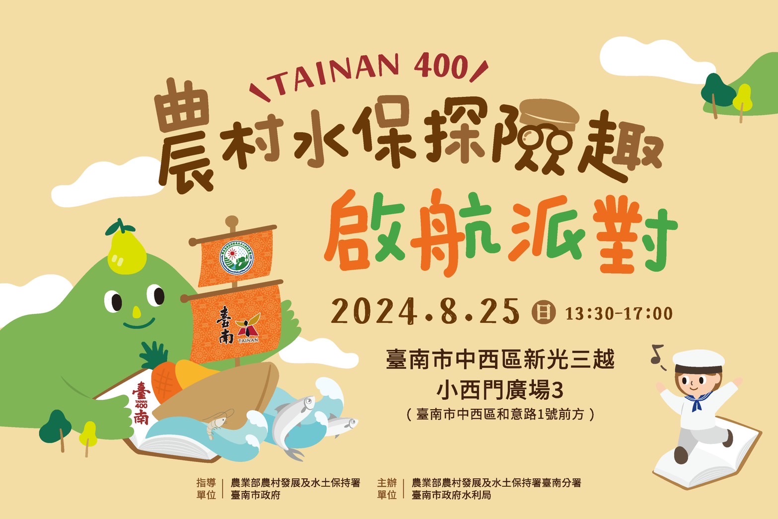【特派員侯翠玲/台南報導】臺南市政府水利局與農業部農村發展及水土保持署臺南分署攜手合辦「臺南400—農村水保探險趣·啟航派對」113年度農村水保主題性大型宣導活動,將於8月25日本周日午後,在臺南市中西區新光三越小西門廣場3(臺南市中西區中西區和意路1號前方)登場。