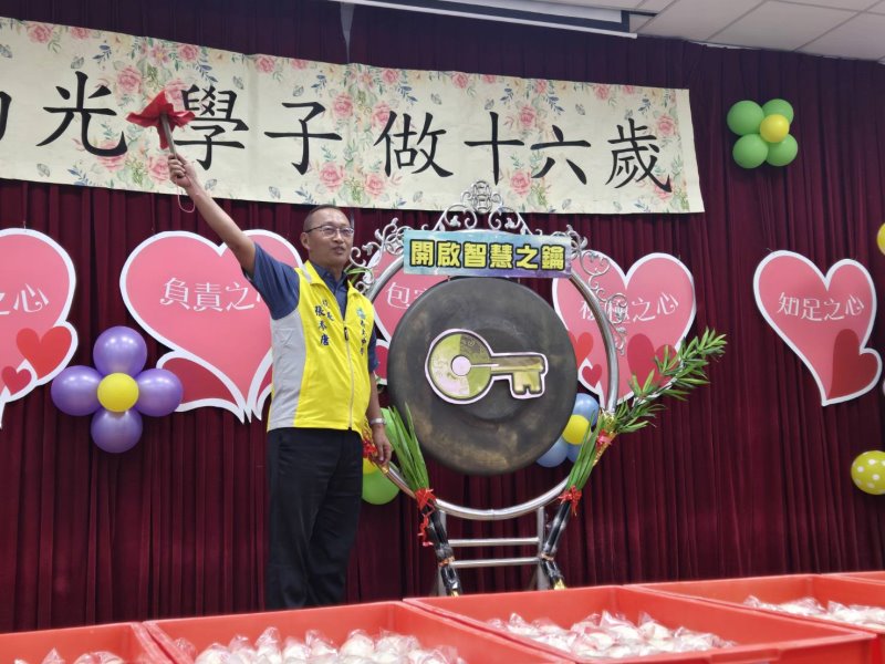 本次活動校長張添唐安排敲響「智慧之鑰」16響大鑼聲,分別由校長、家長會長、委員及師長代表輪流敲響並說出一句四個字的吉祥話之祝福語,期望每位領受成年禮的孩子能有所成長,凡事要存有感恩之心、是非之心、負責之心、包容之心、積極之心及知足之心,等六心的人文內涵,更加孝順父母,並把握時間,增長知識。