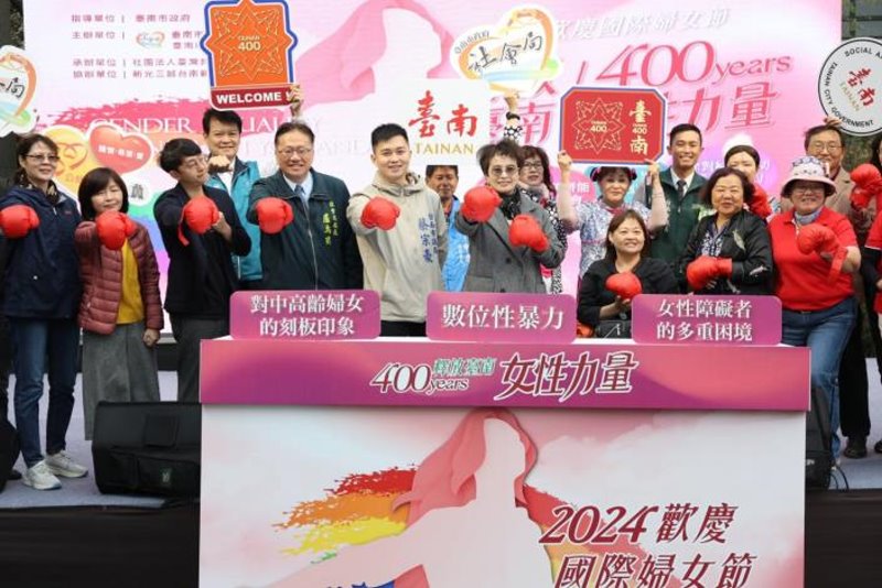 【記者王榮輝/台南報導】今(2)日在新光三越小西門禾藝道由趙卿惠副市長代表黃偉哲巿長,率領社會局盧禹璁局長、各局處及各區公所女性首長共同出席臺南市國際婦女節活動「歡慶2024國際婦女節-釋放臺南400年女性力量」啟動儀式,響應國際婦女節,同時讓更多民眾瞭解市府推動的各項婦女權益與服務,活動由趙副市長偕同市府局處長官戴上手套,代表和市民同一陣線齊心擊倒性別偏見、打破歧視,並宣示臺南市致力提升婦女福利,推動女性族群間的平權倡議、社會參與、性別平等與多元族群,呼籲女性朋友從心覺醒,相互激勵共融,推動善與愛的正向循環。