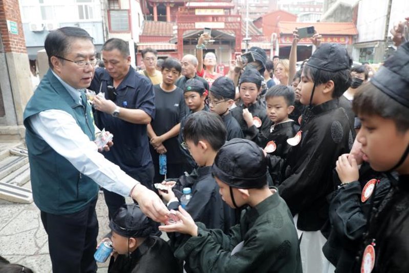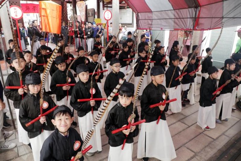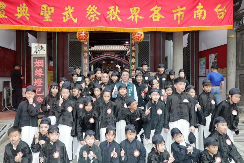 祭奠禮樂生由台南文廟以成書院院生擔任,六佾舞則由立人國小55位學童演出,佾生在學校老師及廟方引領下,行迎神禮表達對武聖的崇高敬意;典禮結束後,市長黃偉哲特別與參加演出的學童合影留念,讓小朋友留下難得的回憶。