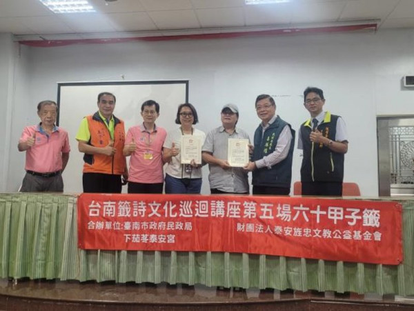 【記者黃石泉/台南報導】台南市政府民政局與財團法人泰安旌忠文教公益基金會於10月12日至13日在後壁泰安宮舉辦「台南籤詩文化巡迴講座(第五場)」圓滿完美落幕,本次活動吸引了各宮廟執事幹部、解籤員及文史工作者熱烈參與,並由多位籤詩專家與學者親臨指導,深入淺出地解析籤詩文化的歷史淵源與其在現代社會的意義。透過講座,與會者對於如何正確解讀籤詩以及籤詩文化的實踐,均有更深入的了解。