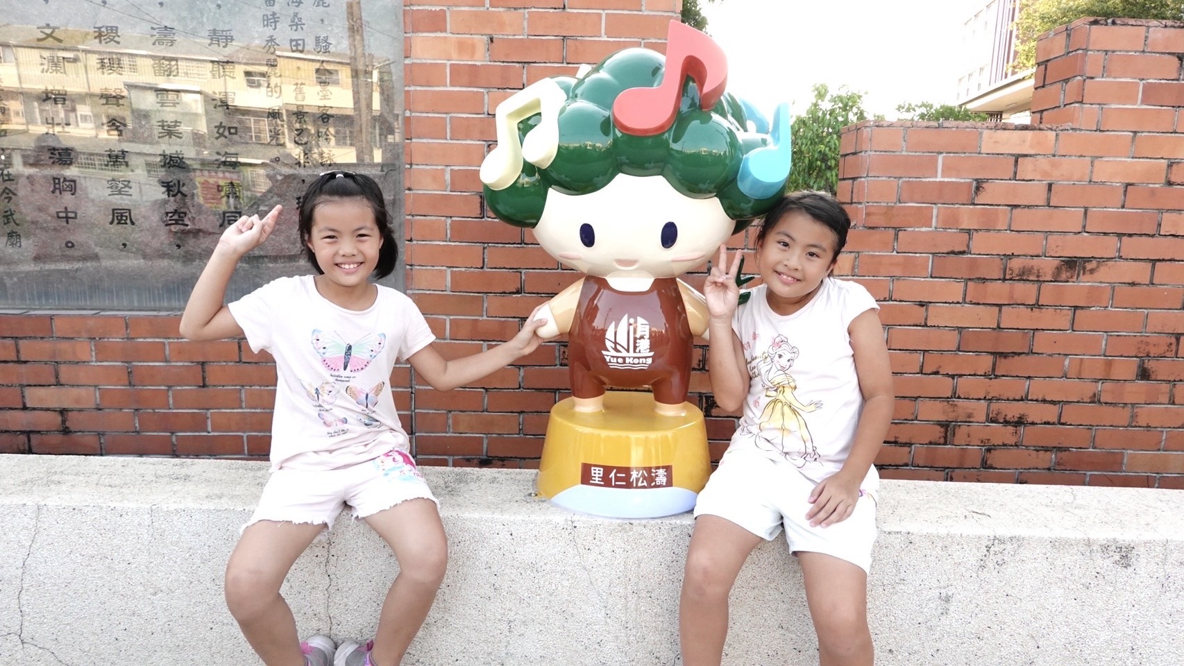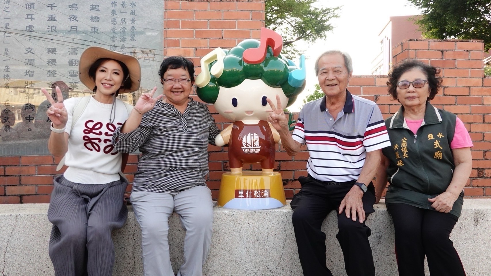 小旅行團體與聚波漁火Q版公仔在鹽水大眾廟聚波漁火巨石前合影