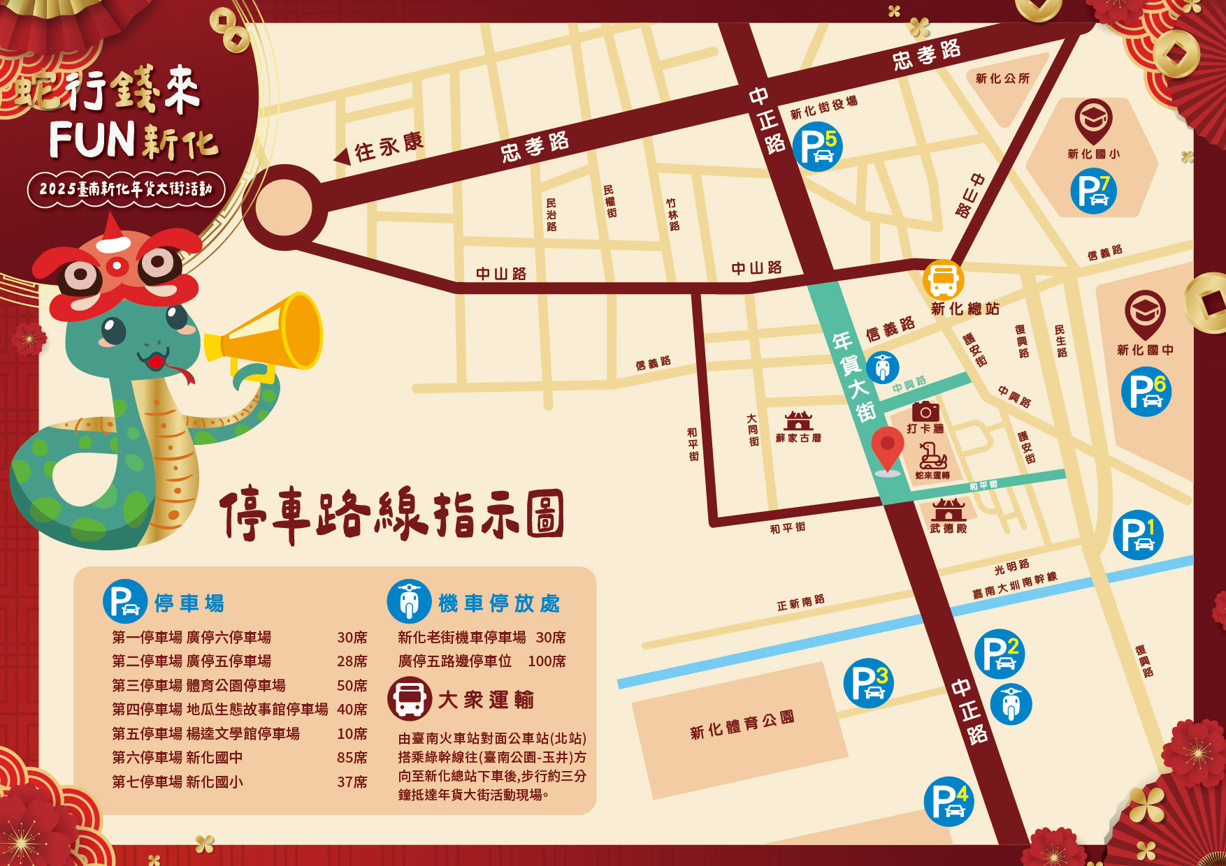 此外,為刺激買氣及帶動人潮,舞台區安排了一系列的精采表演,持續六天的活動由藝人、在地社團、街頭藝人等接力帶來數十場次表演饗宴,此外在活動期間,本年度特別在大目降廣場周邊設計布置蛇年主題吉祥物打卡牆,及武德殿周遭光環境布置,於現場拍照打卡送限量蛇年紅包發財金,吸引民眾前來新化感受年節魅力。