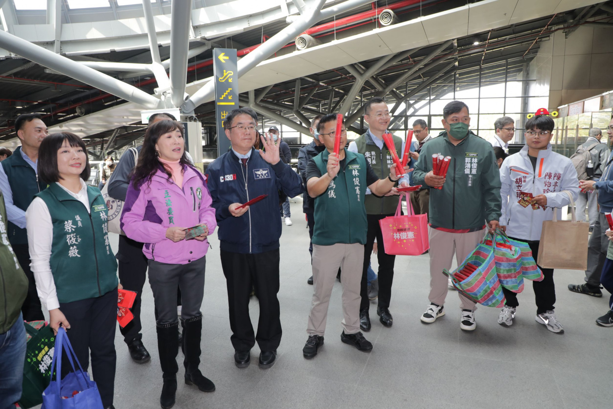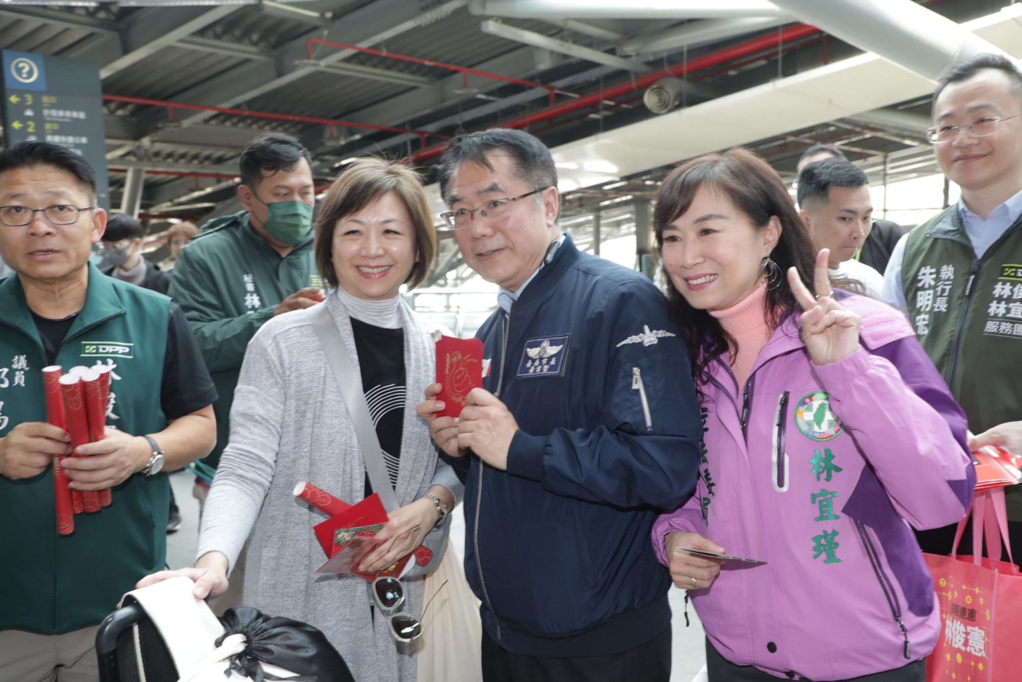 臺南市長黃偉哲攜手立委林宜瑾及多位議員,於1月25日現身高鐵臺南站發送春聯,迎接返鄉市民與來臺南旅遊的遊客。